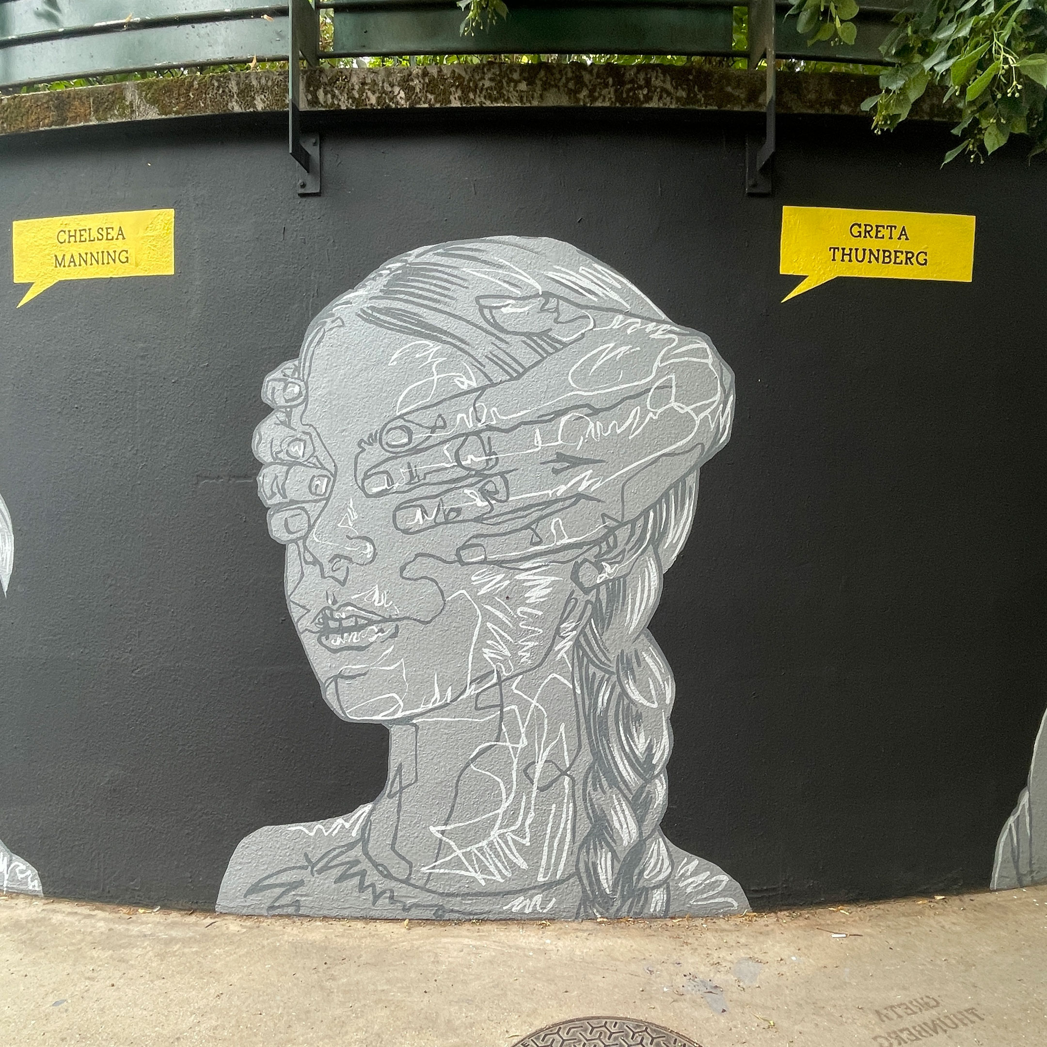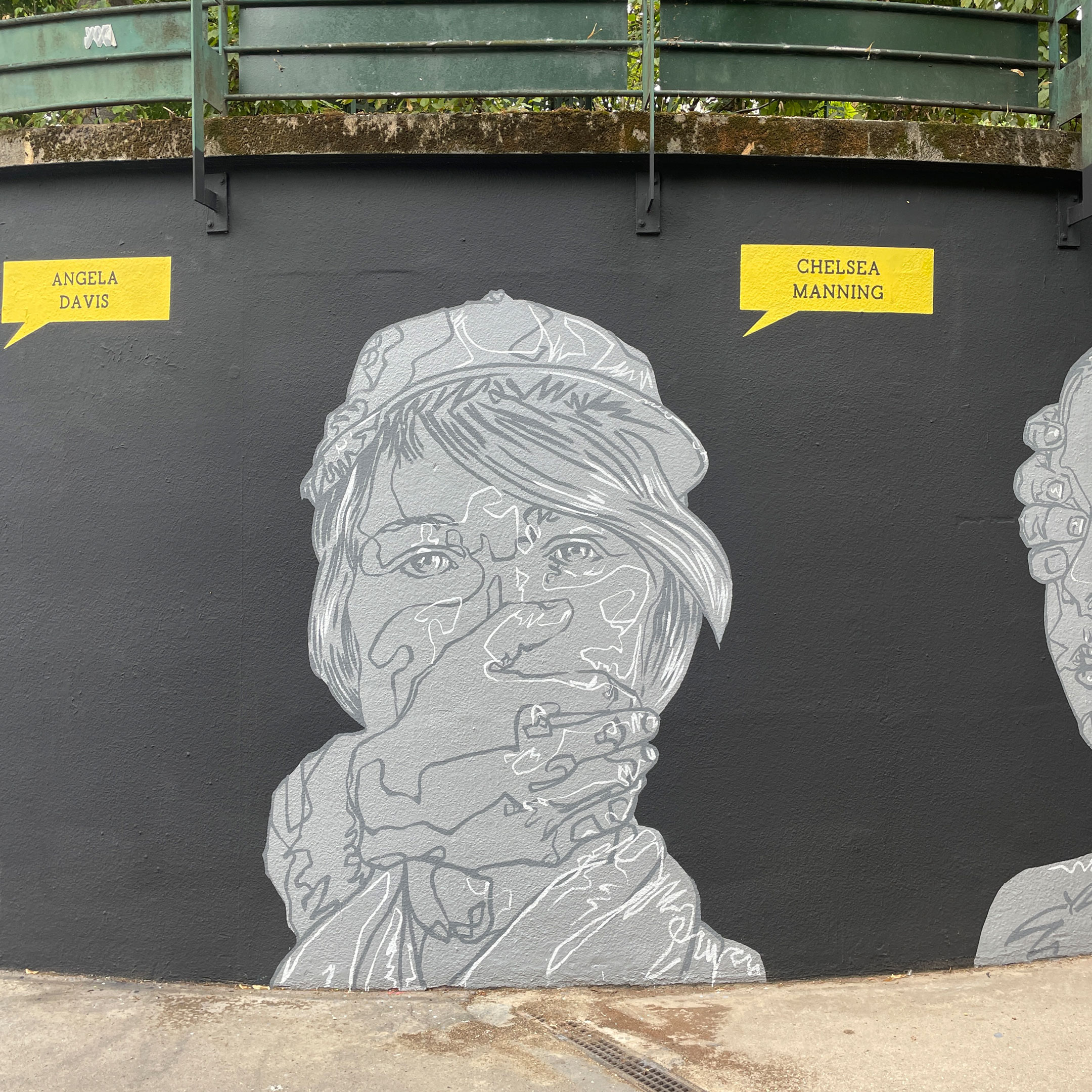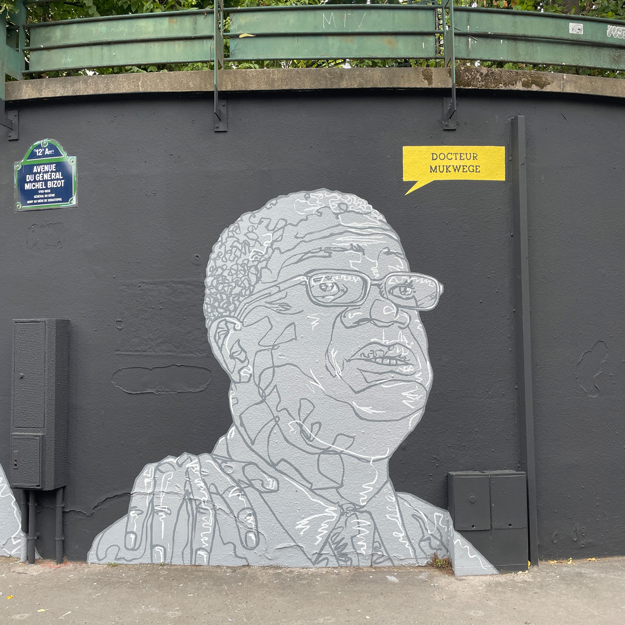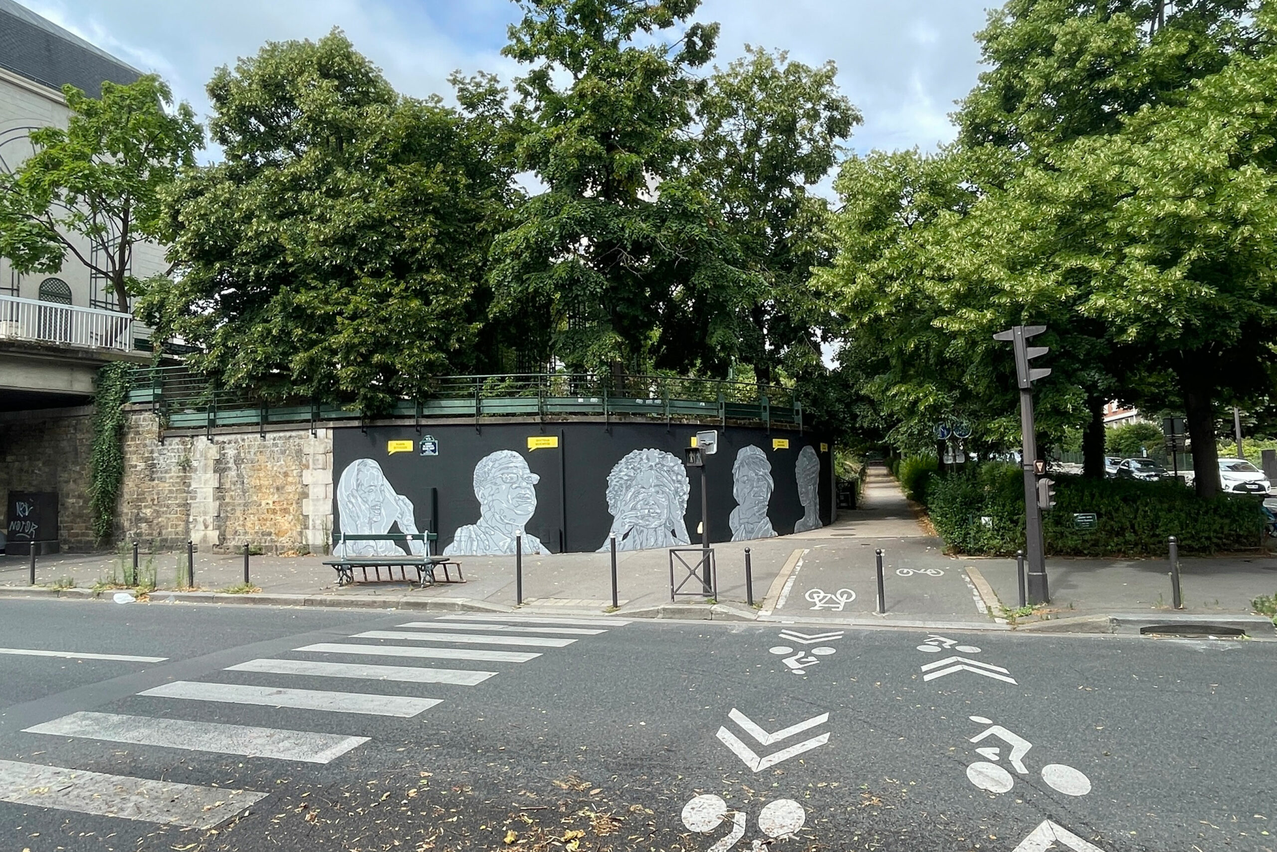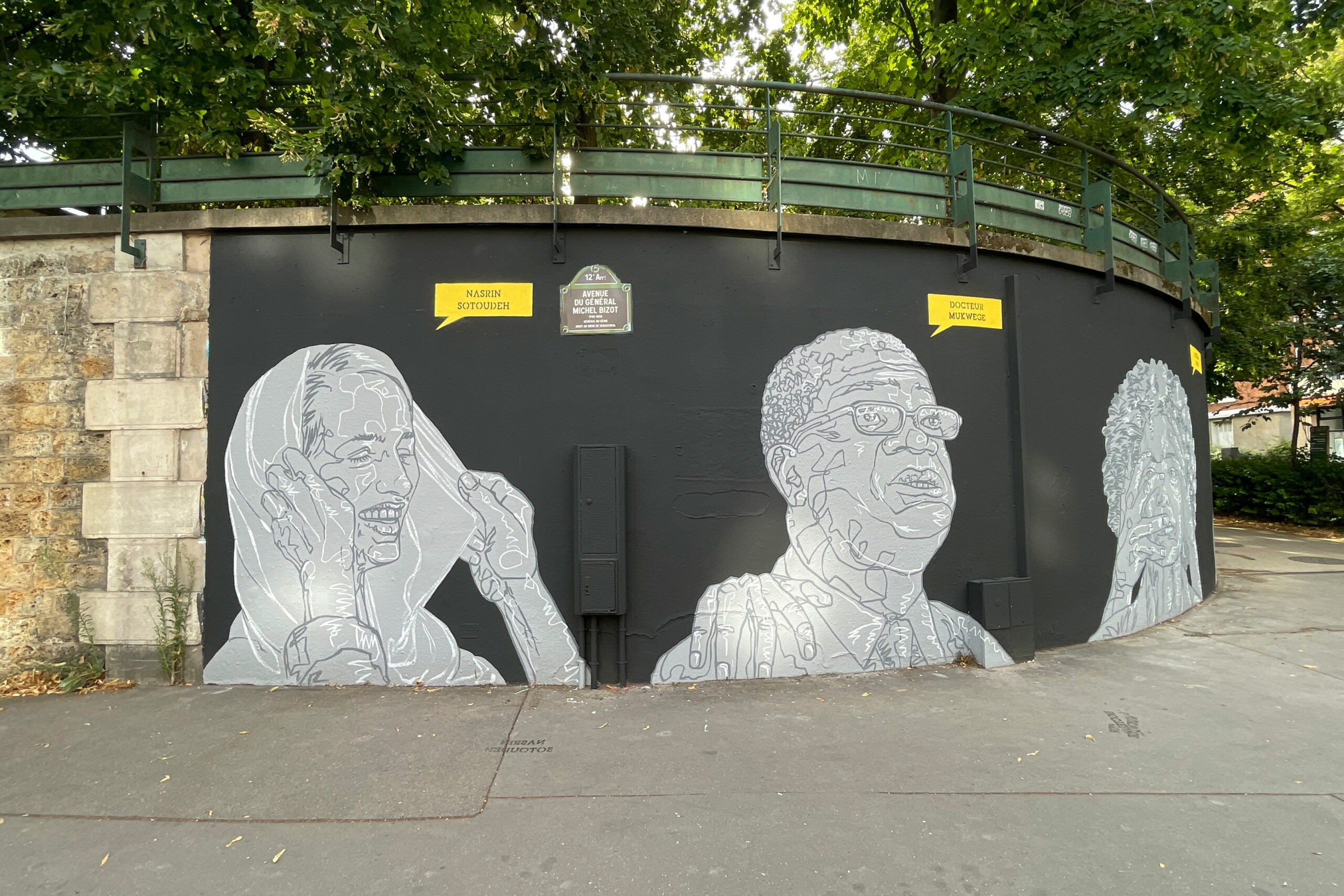 C’est un long mur de 20 mètres de long sur 5 mètres de haut sur lequel six portraits éclatent comme des cris. Quelques minces traits de blanc tranchant sur un mur sombre et des visages soutenus ou contraints par des mains amicales ou hostiles. L’une ajuste un voile sur la tête de l’avocate Nasrin Sotoudeh. L’autre est posée sur l’épaule du docteur Mukwege. D’autres encore cachent les yeux, obstruent une bouche, soutiennent un visage, un cou. Des mains comme des signes de solidarité ou d’oppression envers les courageux·ses défenseur·es des droits humains que célèbre ce mur, le premier dédié aux droits humains de la capitale. Un espace symbolique mis à disposition par la Mairie de Paris pour célébrer les libertés, promouvoir les droits fondamentaux et lutter contre toutes les discriminations.
